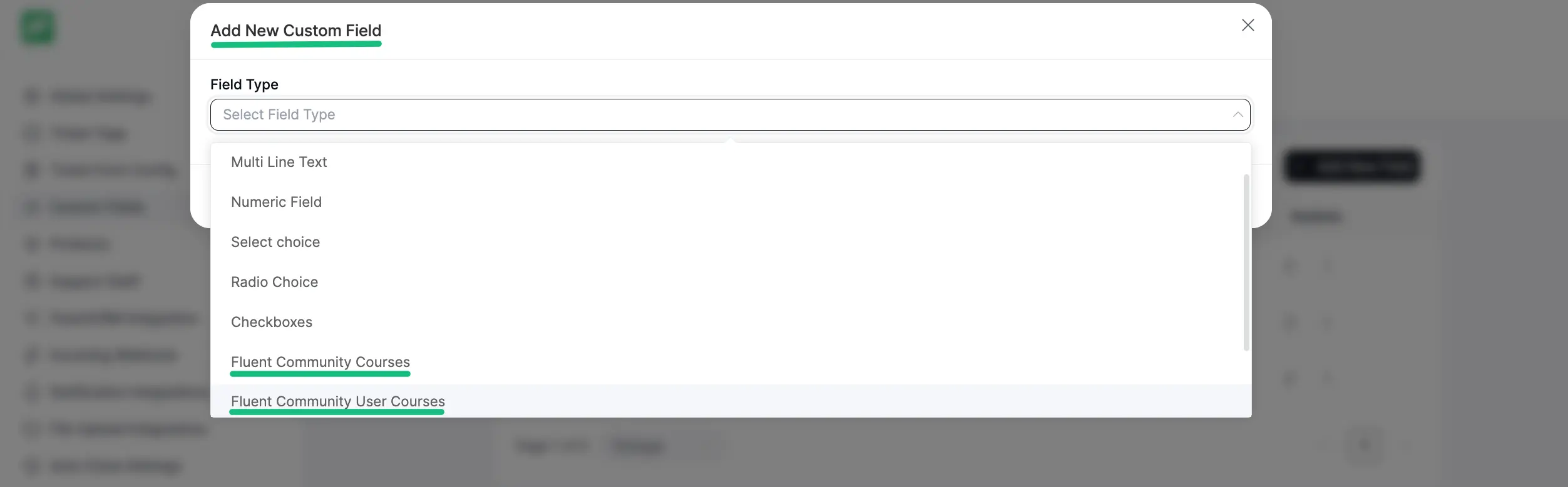 A modal window titled Add New Custom Field will appear. In the Field Type dropdown menu, you must select Fluent Community Courses or FluentCommunity user Course.