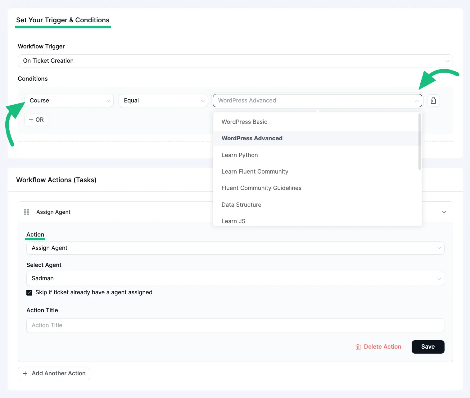 Workflow Actions : You can then define the Actions that should run when the conditions are met, such as assigning the ticket to a specific agent from the dropdown option. Also you can add multiple actions by clicking the Add Another Actions button.