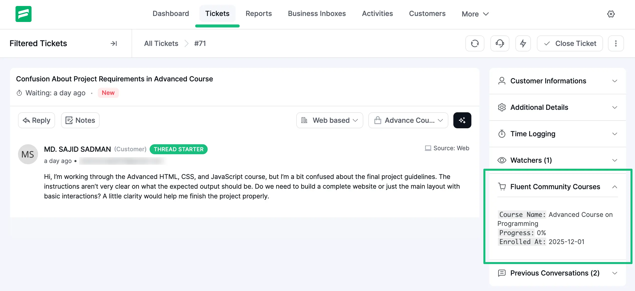 When an agent opens a support ticket, the FluentCommunity Widget will appear on the right sidebar, providing immediate context about the customer’s course enrollments.
